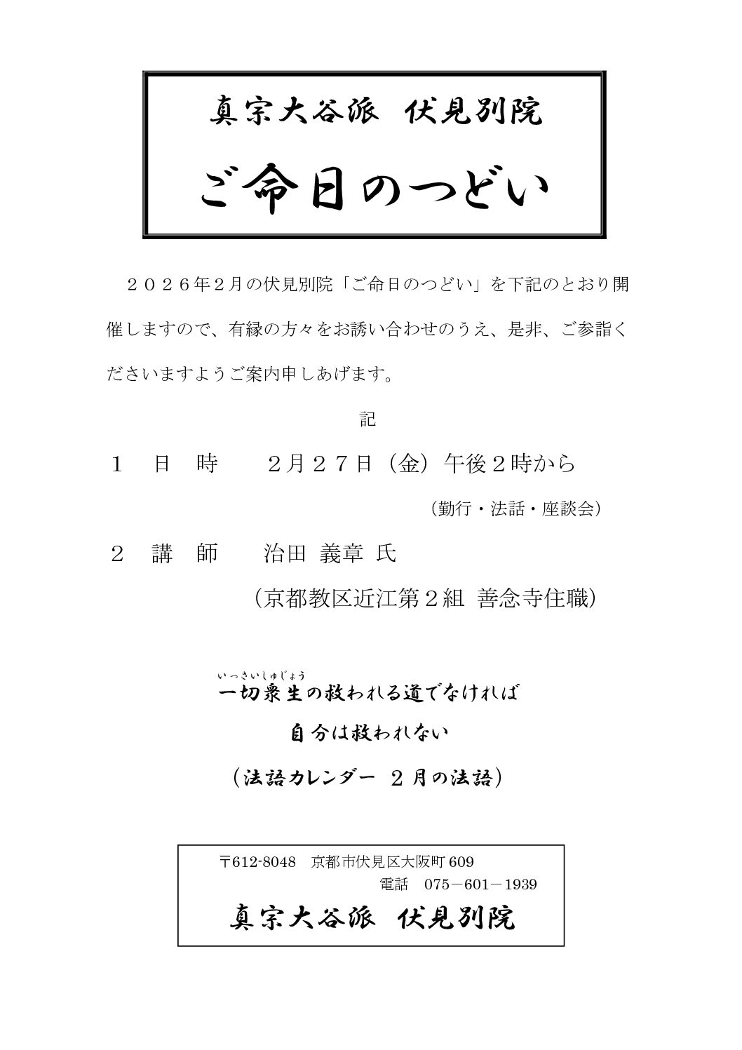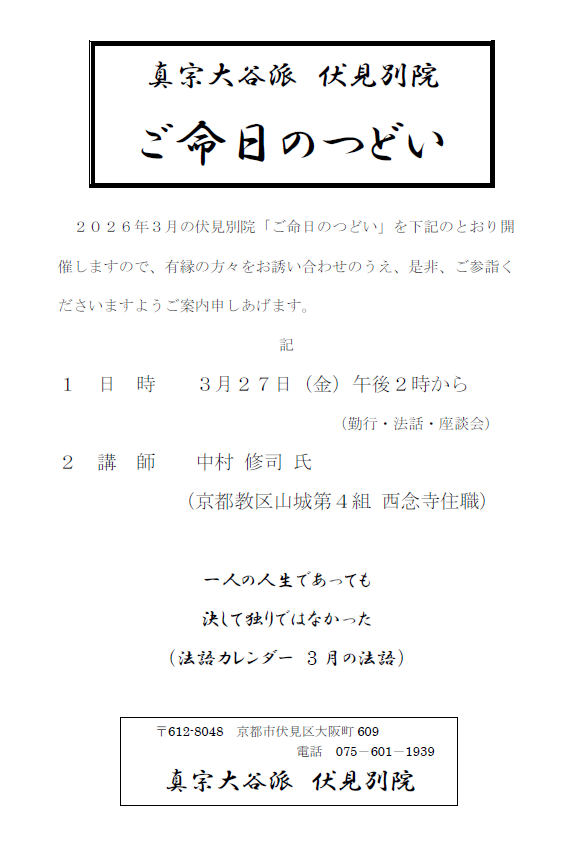 【日時】2026年3月27日(金)午後2時から【場所】伏見別院 本堂【御法話】講師 中村 修司 氏(近江第4組 西念寺住職) 本堂にてお勤めの後、講師より御法話をいただきます。〒612-8048 京…